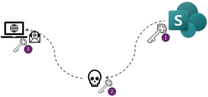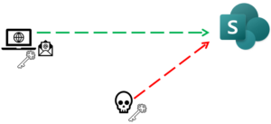 James kan gewoon werken met SharePoint, maar de hacker kan dit nu in de gegevens van James door dit authenticatie token te hergebruiken.